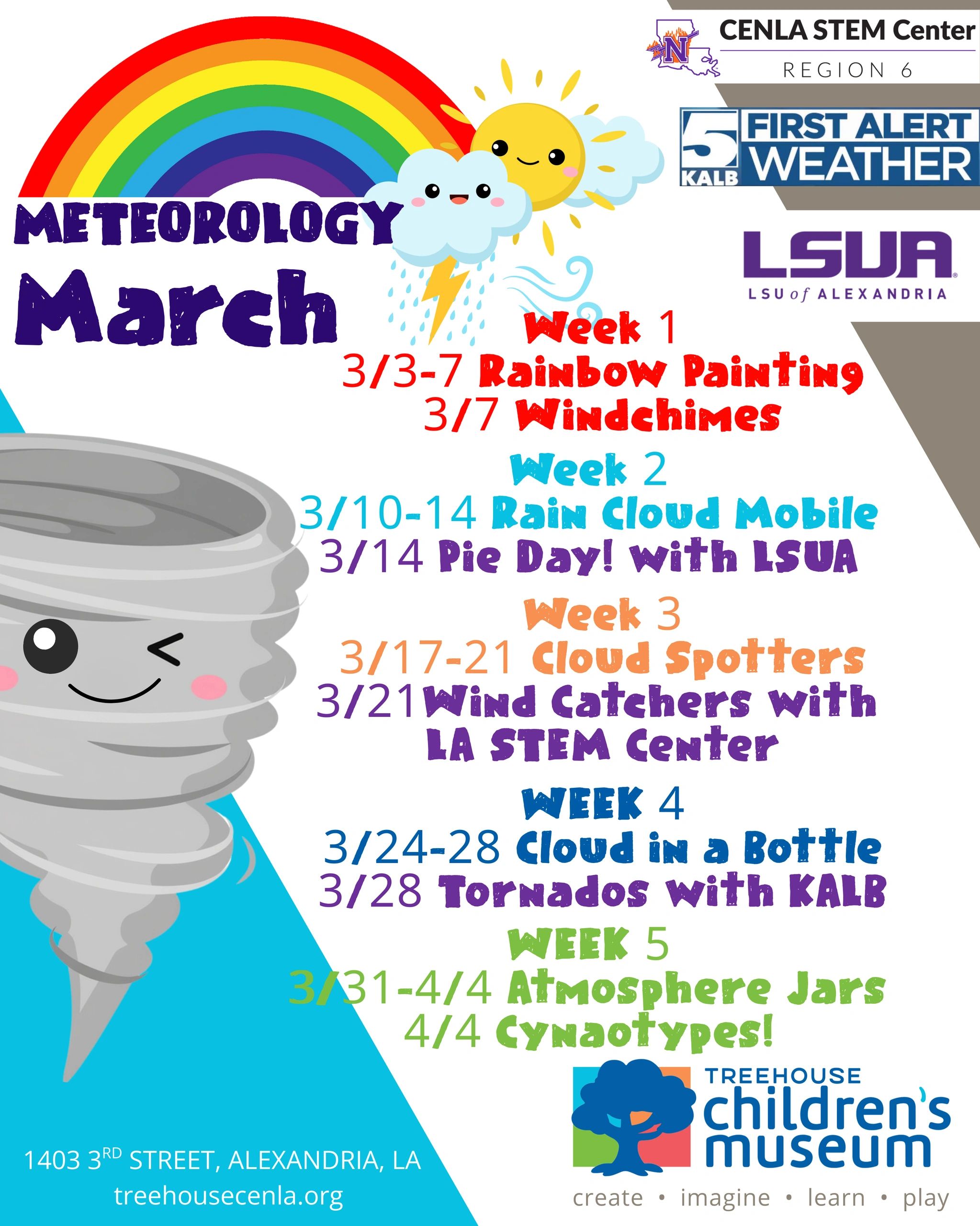 Get ready for a full month of hands-on weather science, creative experiments, and exciting community partnerships during Meteorology March! All month long, children will explore the wonders of the atmosphere through art, STEM activities, and special guest collaborations.
